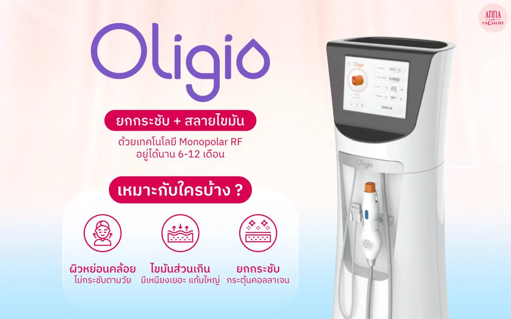 • Oligio ใช้คลื่น Monopolar RF ในการรักษา จะทำงานบริเวณผิวหนังชั้นหนังแท้ และชั้นไขมันใต้ชั้นผิว  เหมาะกับผู้ที่มีไขมันสะสม มีแก้ม เหนียง คาง 2 ชั้น ต้องการลดไขมัน ให้ผิวแน่นกระชับ  เหมาะสำหรับผู้ที่มีกรอบหน้าไม่ชัด มีริ้วรอยรอบดวงตา