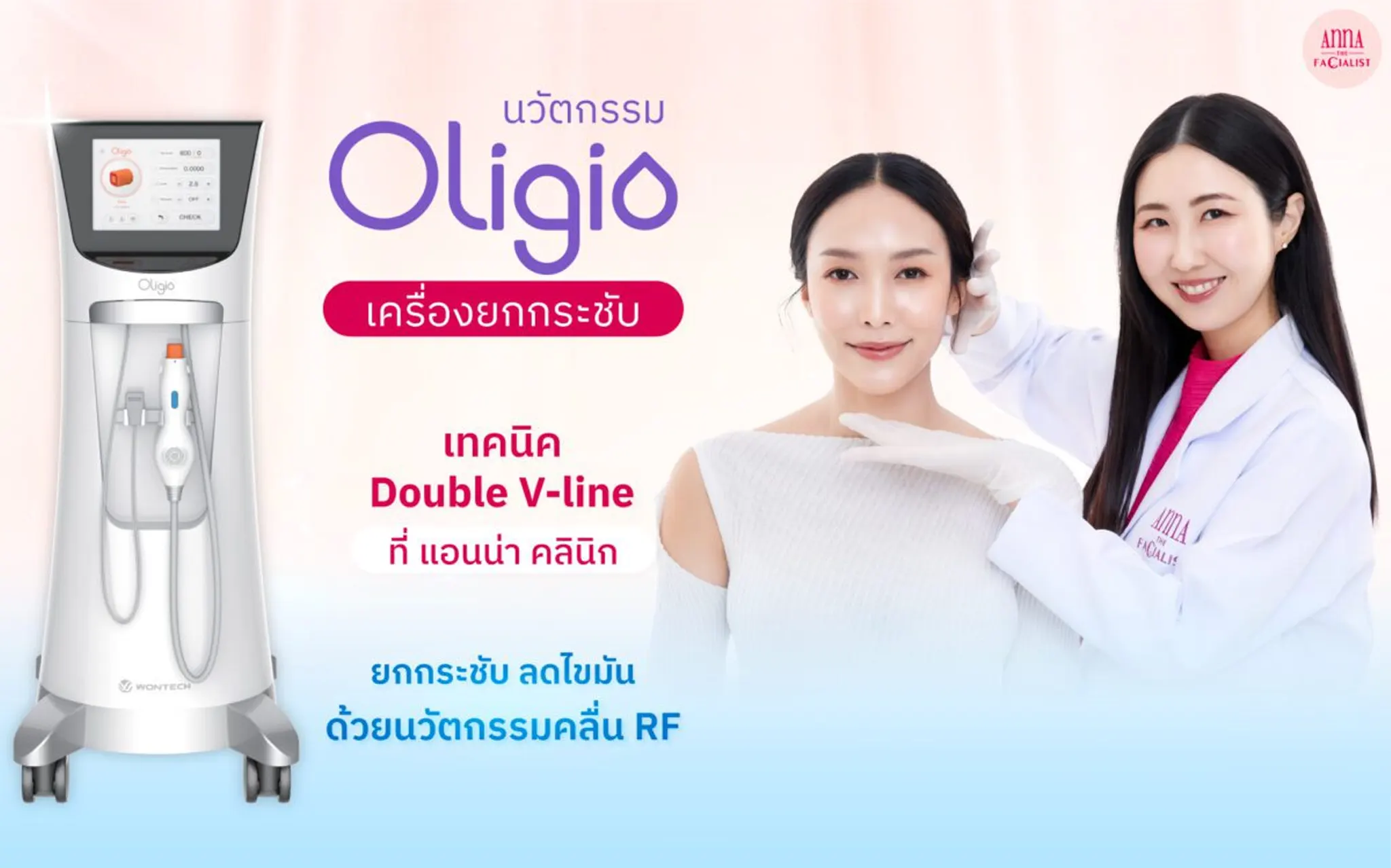 – เทคนิคการยิงเครื่องยกกระชับ Oligio ที่ Anna Clinic จะเรียกว่า Double V-line Technique ยิงเก็บกรอบหน้าบน-ล่าง เพื่อยกกระชับ เก็บแก้มห้อย และเหนียงที่หย่อนคล้อย เทคนิคนี้จะช่วยยกกระชับกรอบหน้าแบบขั้นกว่า ยกจริง เห็นผลหลังทำทันที 20% และเห็นผลชัดเจนที่ 1-3 เดือน