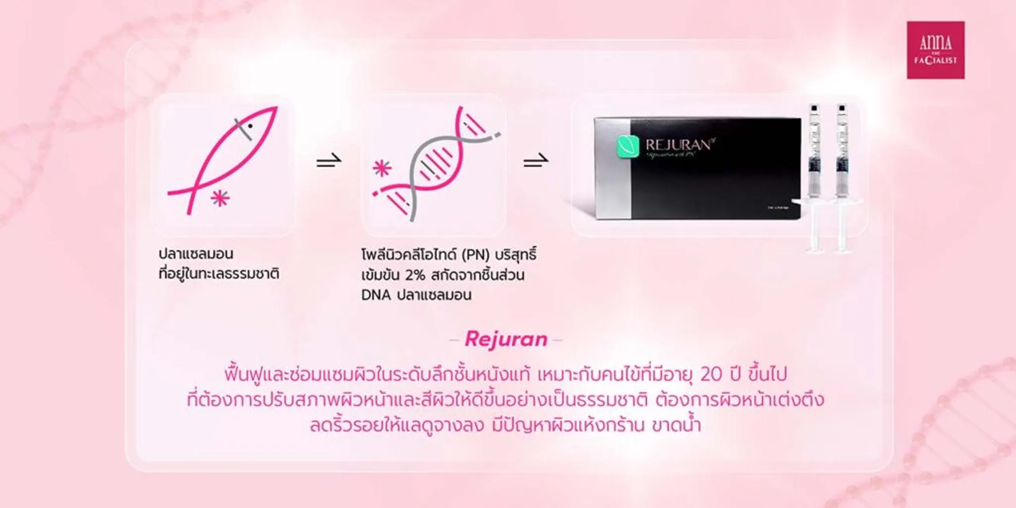 Rejuran โปรแกรมรีจูรัน ส่วนประกอบหลักคือโพลีนิวคลีโอไทด์(Polynucleotide) หรือ PN บริสุทธิ์ เข้มข้น 2% สกดัจากชิ้นส่วน DNA ปลาแซลมอนที่อยู่ในทะเลธรรมชาติ ซึ่งมีความคล้ายคลึงกับ DNA มนุษย์ Rejuran รีจูรัน เป็นเทคโนโลยีทางการแพทย์ที่ผ่านการรับรองจาก อย.ไทย และมีงานวิจัยรับรอง