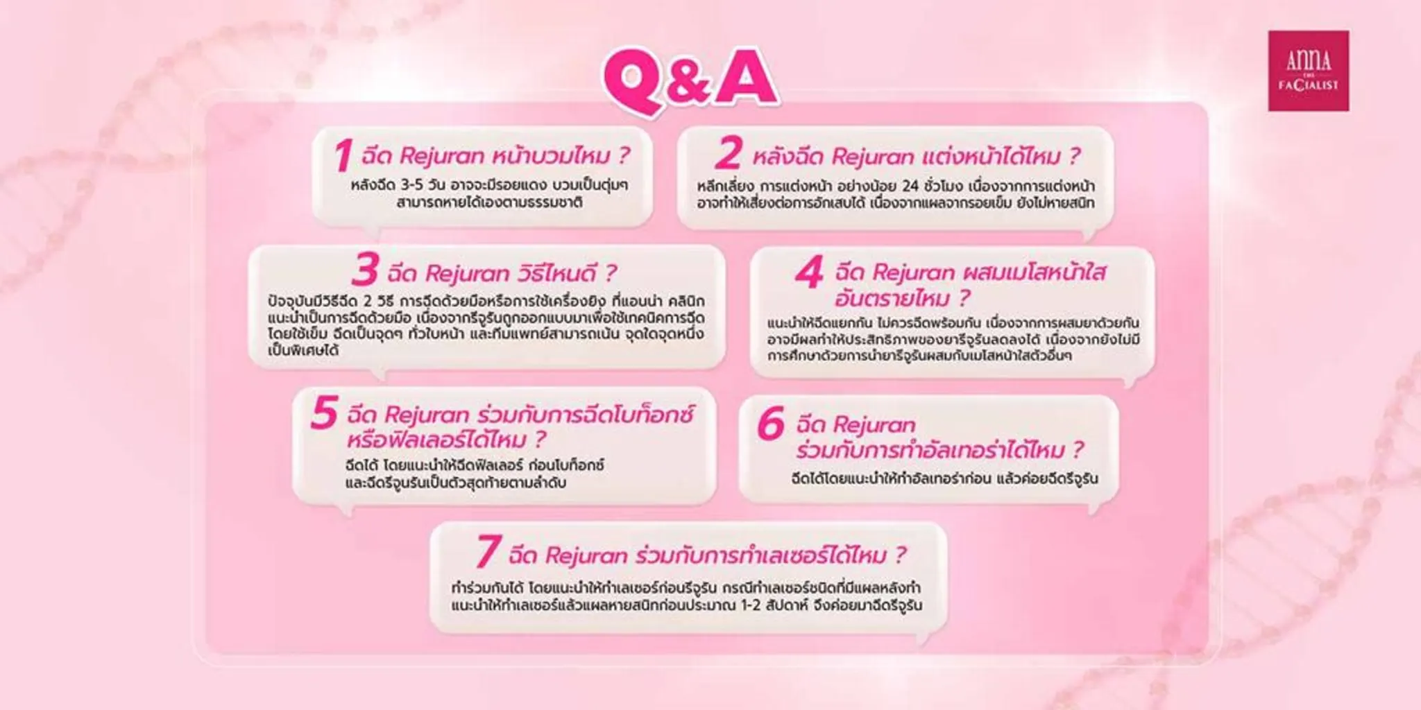 - รีจูรัน Rejuran ที่ฉีดเป็นของแท้ ตรวจสอบได้ ทีมแพทย์จะแกะกล่องให้ดูต่อหน้า โชว์จำนวน CC ที่ฉีดจริง และให้คนไข้นำไซริงค์กลับบ้านได้ เพื่อให้คนไข้มั่นใจว่าของแท้ และมีคุณภาพ